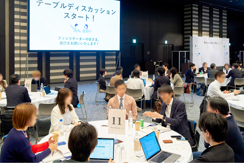 ファシリテーターの進行のもと、各テーブルで共感したポイントや自社で取り組もうと思った点などを振り返りながら、講演内容について理解を深めます。業種の異なるマーケター同士の対話は、まさに「ここでしかできないディスカッション」です。